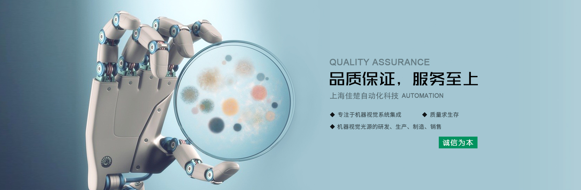 上海佳楚自動化科技有限公司(簡介:JC),自成立以來專業(yè)從事機(jī)器視覺光源的研發(fā)、生產(chǎn)、制造、銷售為一體的公司,專注于機(jī)器視覺系統(tǒng)集成。公司立足于機(jī)器視覺和工業(yè)自動化領(lǐng)域,打造機(jī)器視覺高端產(chǎn)品;在緊固件、汽車零部件、醫(yī)療器械、IC電路、精密工件加工、半導(dǎo)體封裝、藥品生產(chǎn)、包裝、食品飲料等各行業(yè)為客戶提供專業(yè)的視覺檢測解決方案。公司本著“誠信為本"和"質(zhì)量求生存"的企業(yè)文化,秉承“創(chuàng)新一流、追求卓越、永續(xù)經(jīng)營“的經(jīng)營理念,以“品質(zhì)第一,服務(wù)至上”作為我們的質(zhì)量方針,把“誠信、負(fù)責(zé)、創(chuàng)新、團(tuán)隊(duì)”作為公司不斷發(fā)展的追求目標(biāo),專業(yè)為客戶提供完善一流的解決方案。公司已擁有一批經(jīng)驗(yàn)豐富的技術(shù)研發(fā)人員,能夠快速為客戶提供優(yōu)質(zhì)的定制產(chǎn)品,JC將始終堅(jiān)持公司發(fā)展的核心理念:誠實(shí)守信,堅(jiān)持創(chuàng)新,用服務(wù)創(chuàng)造價值。